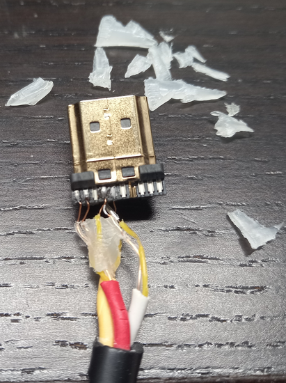 HDMI being all digital, there's narry an audio waveform, let alone an analog TV signal the video hardware designers of the 70s would have felt at home dealing with to be had. But as I stripped back the rubber overmolding no smartypants ICs or miniature video scan converters reared their head.