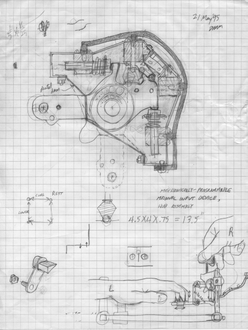 Shown is an end view of four identical modules, one to a finger. Each module has two paddles operated as an analyzing linkage. All eight paddles and their respective bearings are in a sandwich structure stacked on a common axle and held together by a pair of compression screws on the end. The bearing shown can be simplified: all but the outermost ring of ball bearings and its retaining ring can be replaced with a thick washer. Another, larger washer is used to adjust the paddle spacing along the axle. Suggested along-axle distances: ball bearings, 3/32”; paddle thickness, 1/8”, axial spacer, 1/4”; radial spacer, 1/16”.