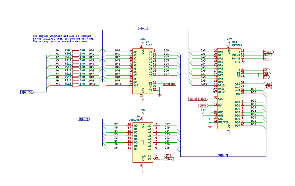 The Crux of the Problem:So we have established, essentially, the circuit has to keep the data bus and the address bus clear of contention whenever the 6847 needs to push out a frame to the display. The circuit does this by separating the address bus with a bank of resistors, and the data bus with a bus transceiver. When the /DRAM signal is generated in the chip set the address bus on the VDG cuts out, the data bus aligns with correct directionality, and the RAM chip is selected. Ultimately this creates snow because the CPU does not know when the VDG is on the RAM it only knows it can knock the VDG off the RAM by writing to or reading from it. This works well, it’s simple and cheap but obviously the issues are:
