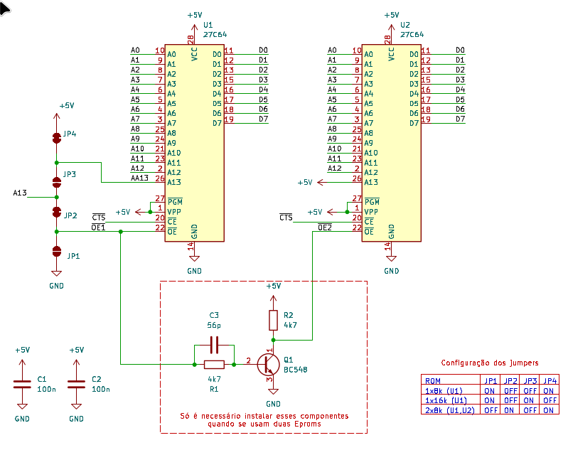 The circuit uses a BJT with a speed-up capacitor on its base to form an inverter for the address line A13 that is used to select either chip is active. That was a very common trick in the 1980s to save on glue logic chips. While such components were not present on the board, it was easy to figure this out given the application.