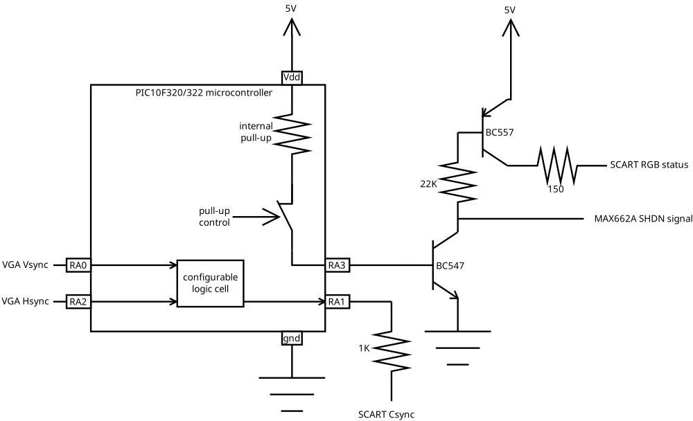 This hack is also useful when the microcontroller does not have enough output pins for your needs. For example, recently I made a VGA to SCART adapter using a PIC10F322 microcontroller. This microcontroller has only four I/O pins (RA0, RA1, RA2, RA3) and a Configurable Logic Cell (CLC). I used the CLC to generate the composite sync signal of the SCART connector from the vertical and horizontal VGA sync signals. I wanted to use one of the output pins to control the SCART RGB status signal and the charge-pump DC-DC converter generating the 12 volts of the SCART CVBS status signal. Unfortunately, the CLC can only use the pins RA0, RA1 and RA2. The only I/O left, RA3, is an input pin. However, it has a selectable pull-up that, according to the manufacturer, can supply at least 25 μA. This is enough to saturate a BC547 transistor so I used the hack to turn RA3 into an output in this way:
