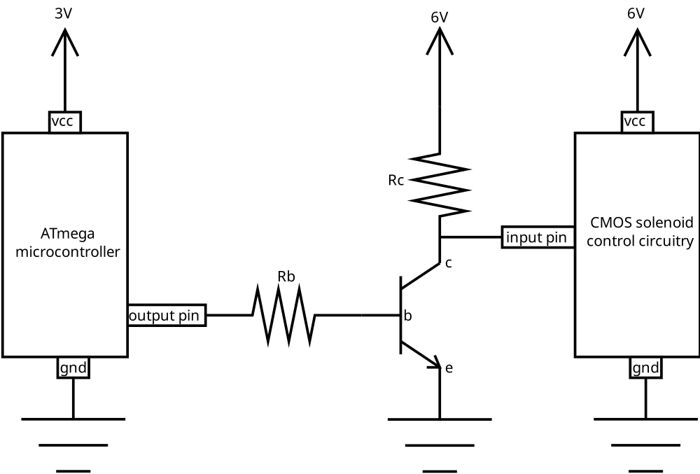 08/30/2018 at 21:55 • 0 commentsIn several of my projects I use the output of a microcontroller to control a bipolar transistor. For example one of my projects was a electronic water gun set. The users of the water guns carry wetness sensors connected to ATmega microcontrollers. If one of the microcontrollers detects the user has been “shooted” it disables his water gun temporally using a solenoid. The microcontroller supply voltage was 3 volts, but the CMOS circuit controlling the solenoid required three input signals with an H voltage of 6 volts. So I used this simple level shifter: