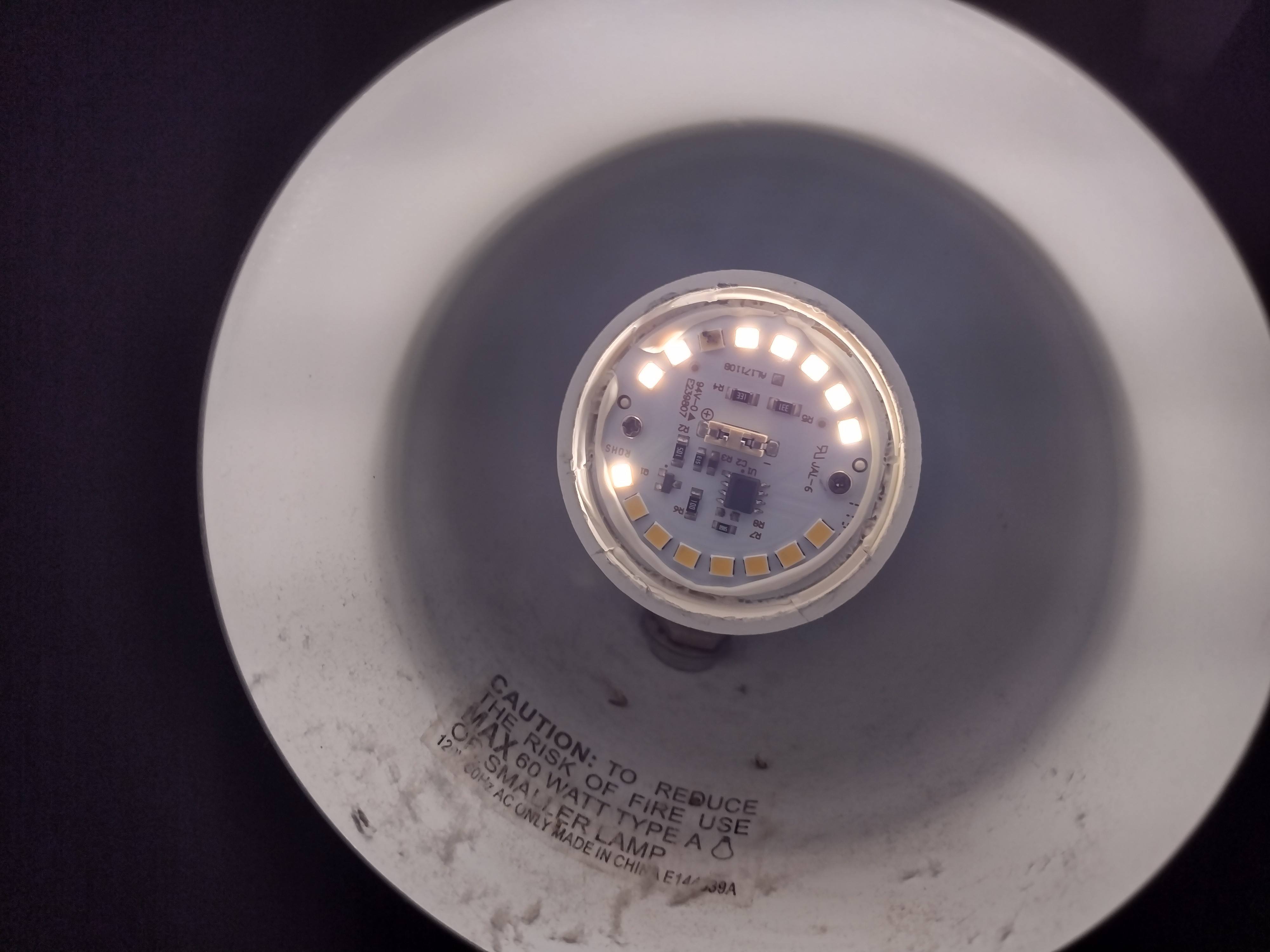 Decided to give an LED bulb (incandescent replacement) a try in my room's light fixture. To my strange joy (or perhaps not so strange for those of us here), it failed after a few weeks (had the flicker of death.) Using a combination of a spudger and a screwdriver, I popped off the cover for a closer look.