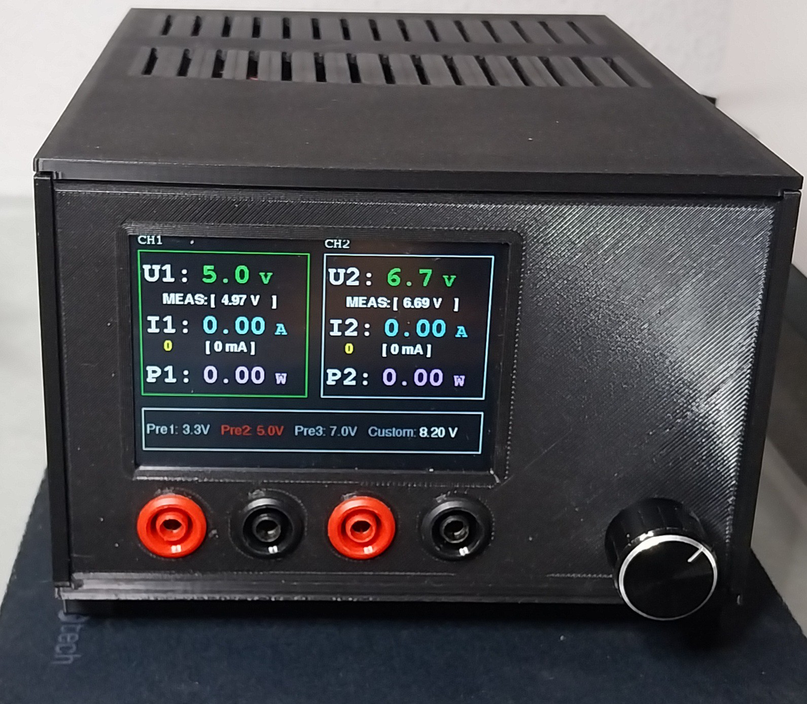 Dual-channel smart lab power supply with ESP32, TFT display, encoder control, current sensing and OTA update support.