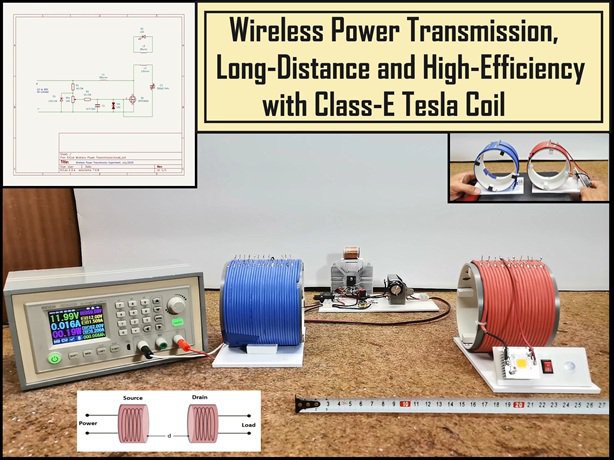 Highly efficient and long-range wireless power transfer system using a modified Class-E Tesla coil, offering significantly improved distance