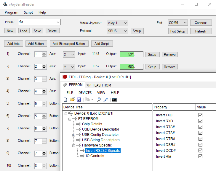 Use the pin-invert function on an FT232 to read an S.BUS stream into a PC without needing extra components to invert the signal. Thereby, take the S.BUS output of an R/C Tx/Rx and pipe it straight into vJoySerialFeeder which parses the packets and maps the values to a virtual joystick for flight-sim or any other use.