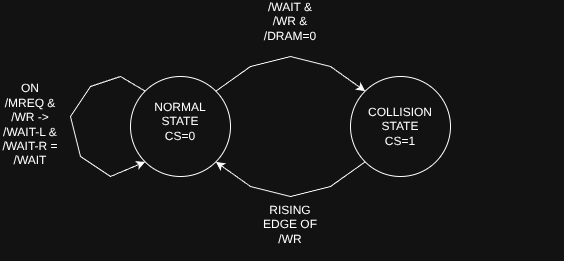 It’s also important to understand that the latched /WAIT bit in the GAL does not directly store the /CS value; it stores the collision status (/WAIT) for the current write cycle. /CS for the VDG port is derived from that state, and it is cleared on the rising edge of /WR. In other words, as soon as /WR rises, /CS drops again, regardless of what the latched /WAIT value was. The collision state only ever lasts for a single write cycle.