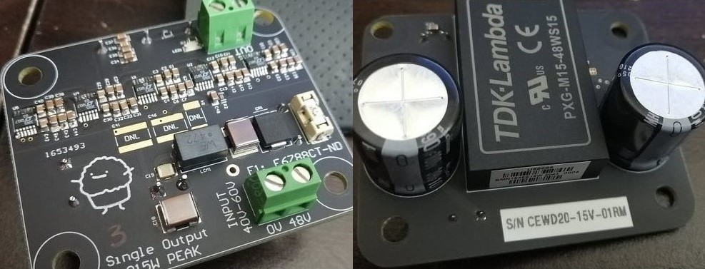 Based on the 5kV/20pF isolated TDK-Lamba PXG-M15 15W DC-DC module series, this board takes an input of 40-60V and converts it to a 15W, 5V/12V/15V regulated output. The voltage depends on 3 of the components loaded to the PCB (i.e. pre-selected). The outputs are regulated by 5 parallel LT3045 ultra-low noise linear regulators. These can be connected in either series or parallel.