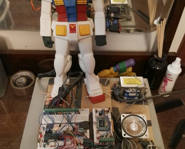 LEDs throughout, a spinning gun, power supply, audio amplifier, music,