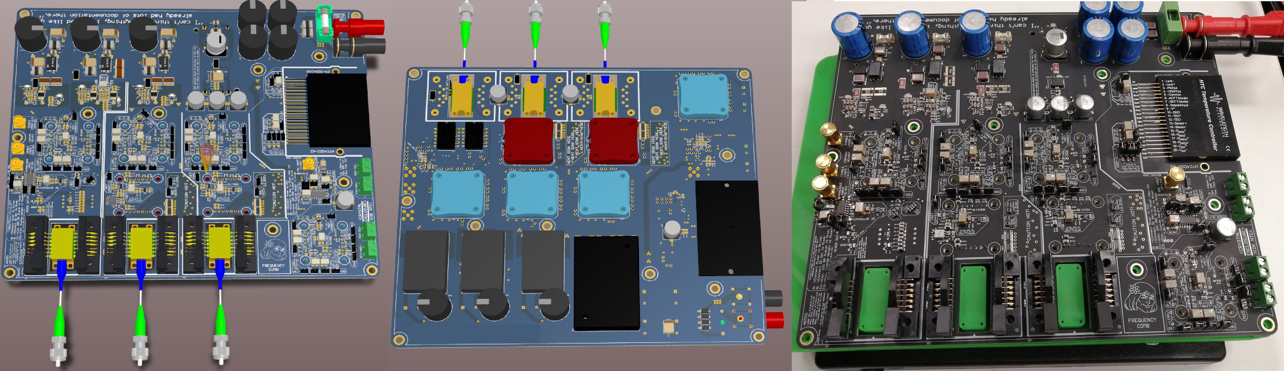 Running off of 48V, this central hub for all your laser action contains 3x laser drivers, 5x TEC temperature controllers and 4x power supply DC-DC bricks with linearly regulated output stages added. Adjustable trim-pots and jumpers galore, it was designed with flexibility in mind and the two galvanically isolated regions of the board can also interact somewhat through an opto-coupler. Finally, one laser driver and one temperature controller can both each be modulated by external voltage signals that are mixed in with variable weighting. All of heat-dissipating components are placed on the bottom layer and mounted to a custom aluminium block (~80W worst case).