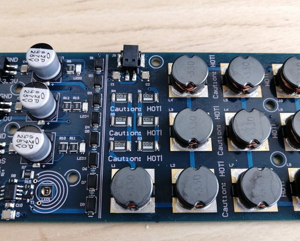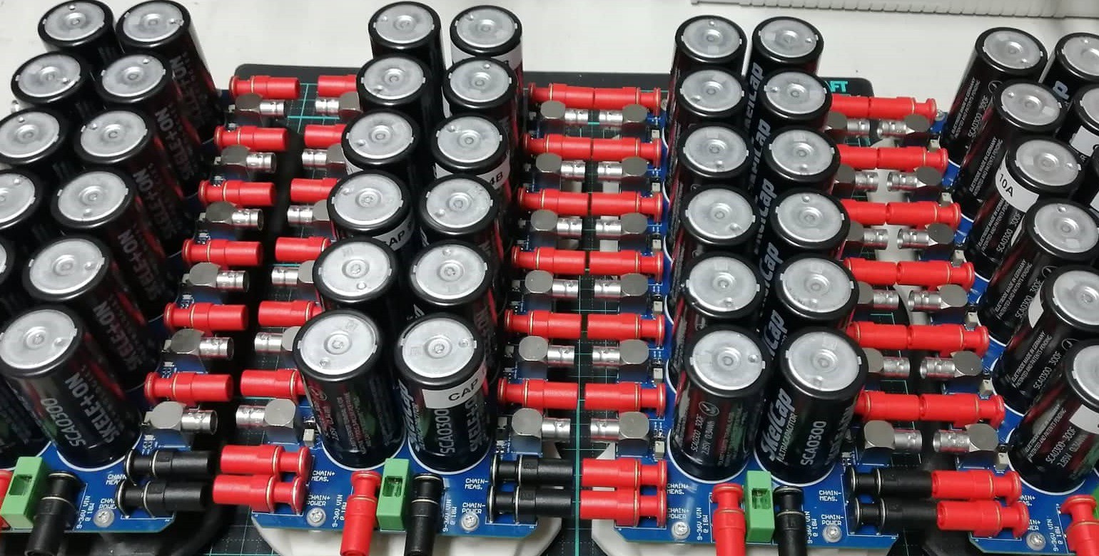 Containing 12x 300F 2.85V supercapacitors each, these boards are used to evaluate capacitor impedances and characteristics. Each capacitor is charged from a separate isolated 1W DC-DC brick/linear combo with a 2-3V set point and 250mA CC limit.