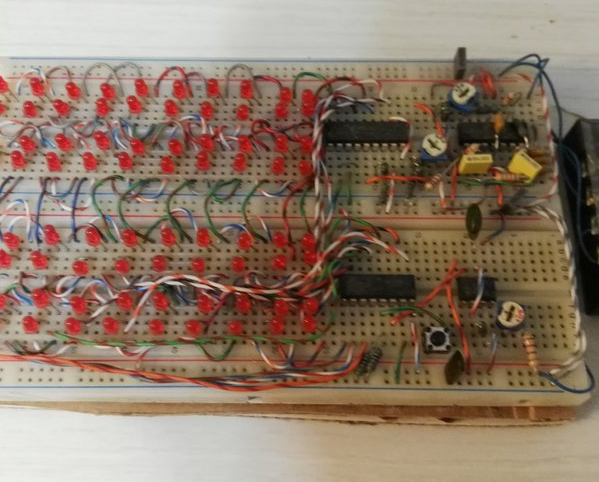 frequencies and then pulses 3 different sets of 10-segment bar graphs