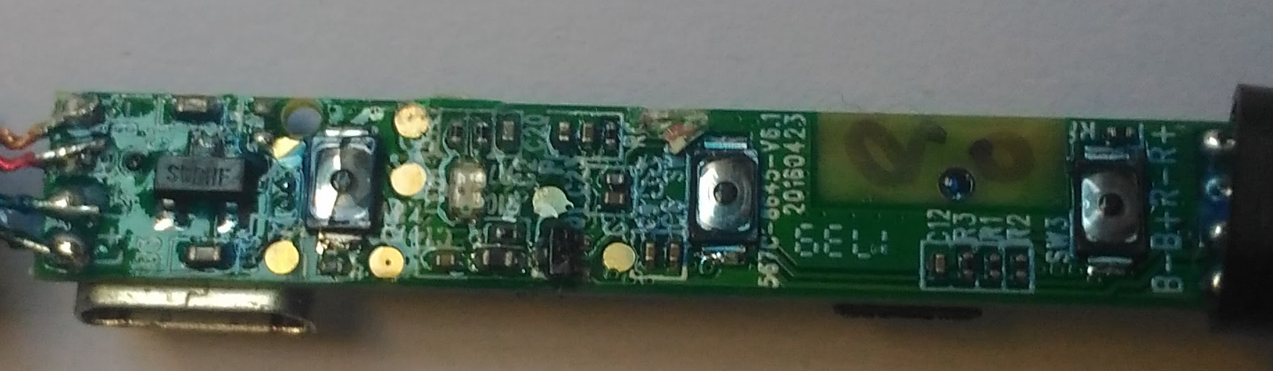 Just underneath this magnet revealed a small PCB for a SOT-23-5 LiPo PMIC covered in conformal coating to help with the water resistance I assume.