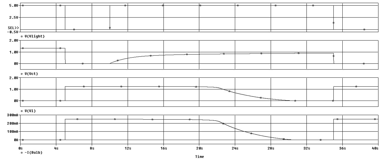 Simulations show that the light bulb turns ON very quickly after the lights are turned OFF and remains fully ON for about 15 seconds after the lights are ON.
