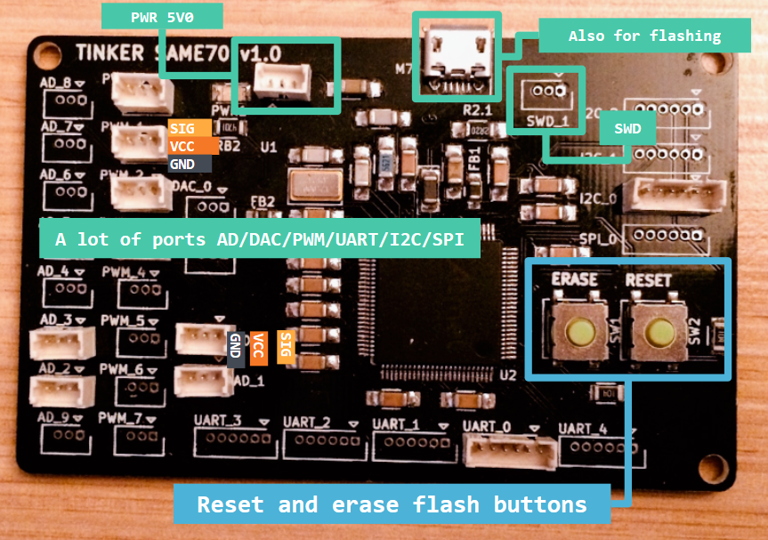 It's a breakout of the Atmel's SAM70 @300MHz that exports the most used interfaces (UART, PWM, I2C,..) using small ports for test purpose