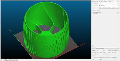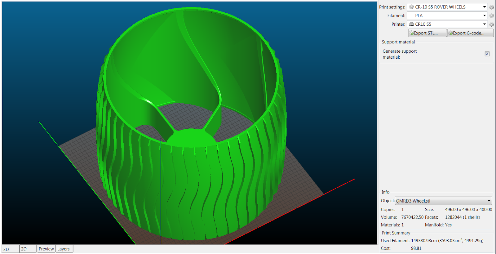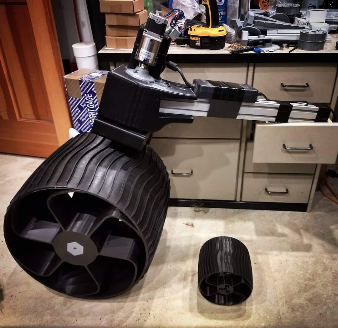 This rover was born out of the necessity for a mobile testbed with flexible mounting options, but is turning into quite a project, both in the amount of work involved as well in the many ways that it represents the bleeding edge of home-workshop additive manufacturing capability. For example, each wheel weighs 5kg and takes 4 days to print (0.8mm nozzle, 0.4mm layer height, 1.2mm extrusion width, single wall and 10% infill), with a material cost of ~$100. A screenshot with the details of the wheel print is below. If you are inclined to build a rover like this, the wheel should be your deciding factor. It is by far the most expensive and largest printed component.