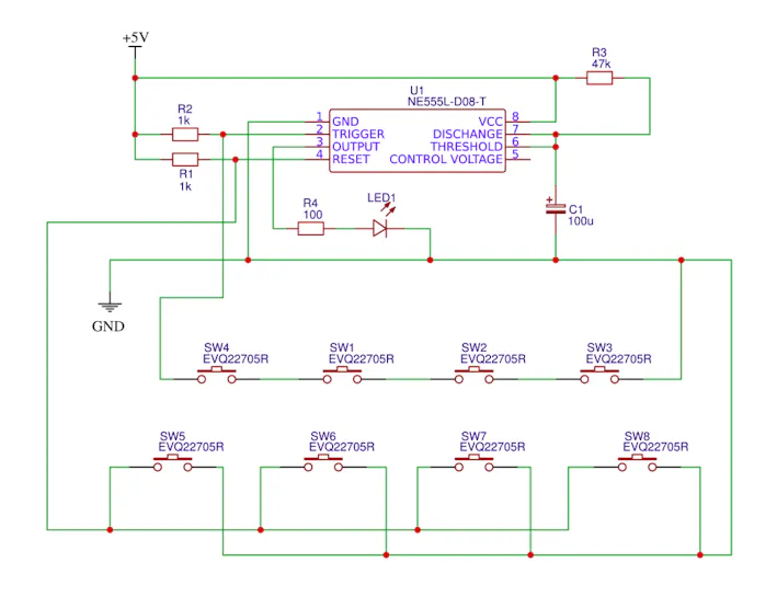 In this simple circuit we are building 555 Timer IC based Code Lock. In this Lock, there will be 8 buttons and one needs to press specific four buttons simultaneously to unlock the Lock. The 555 IC is configured as a Monostable Vibrator here. Basically in this circuit we will have an LED at the output pin 3 which turns ON when trigger is applied by pressing those specific four buttons. LED remains On for some time and then turns Off automatically. The On time can be calculated with this 555 monostable calculator. LED represents the Electric Lock here which remains locked when there is no current and gets unlock when current passes through it. The combination of specific four buttons is the “Code”, which needs to open the Lock.