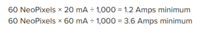Since the WS2812B uses 5v for power and communication, and the Oak uses 3.3v, I'll be using the Oak's 5v->3.3v voltage regulator to power the ESP8266 (built in already) and as the voltage reference for the logic shifter. The WS2812B will take straight 5v from the USB supply. Typical USB ports off a computer offer 500mA on the high end. I'll use this as my low-bar for supplied power, as most USB Power supplies and batteries offer more than this. The NeoPixel (brand name of WS281x series) guide over at Mouser offers a quick rule of thumb estimate of 20mA for standard operation, and 60mA peak per RGB LED. Apparently the logic circuitry on the chip consumes very little power.
