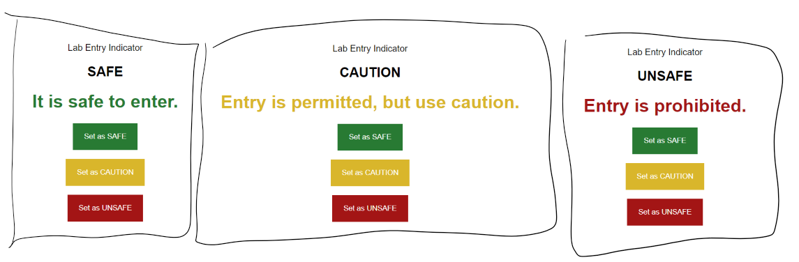After playing around with the HTML and CSS for a bit, and some of the logic, I have the device updating the state variable (Safe, Caution, Unsafe) whenever the user passes a Get request for a the /state/{state goes here}. I can use this as a call method later from a control device. For the web-ui, there's 3 buttons to set the different states, and the current state indicated on the page, along with some helper text. The state does not survive a reboot (intentionally, at the moment as I expect the person changing the state to be the most unreliable element of the flow -- I can implement in EEPROM memory later if I decide to alter my workflow), so when the device first boots up it holds an "unknown" state (blue on the LED), and suggests manually evaluating the situation before attempting to enter.