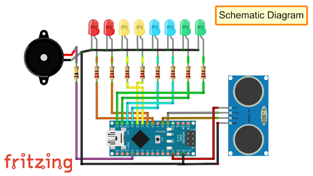 In this video, I am going to use an ultrasonic sensor to calculate the car's distance from the garage wall and display it using green, blue, yellow and red LEDs. The color of LEDs indicates whether to keep moving, slow down, stop or go back.