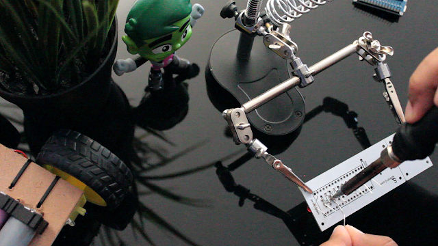Next, its time for me to solder the ultrasonic sensor to the bottom bit of the board.
