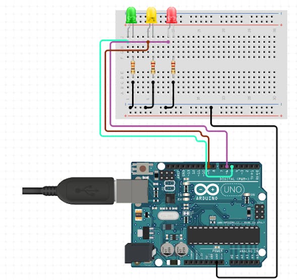 3. Locate a 100-ohm resistor onto positive end of the LEDS then connect a wire from a resistor to the relevant pins on the Arduino.