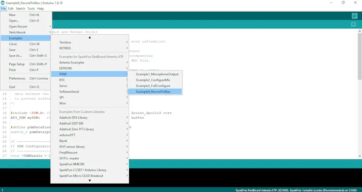 Select the board as Artemis ATP then from File->Examples->Sparkfun Redboard Artemis Example->PDM->Record_to_wav
