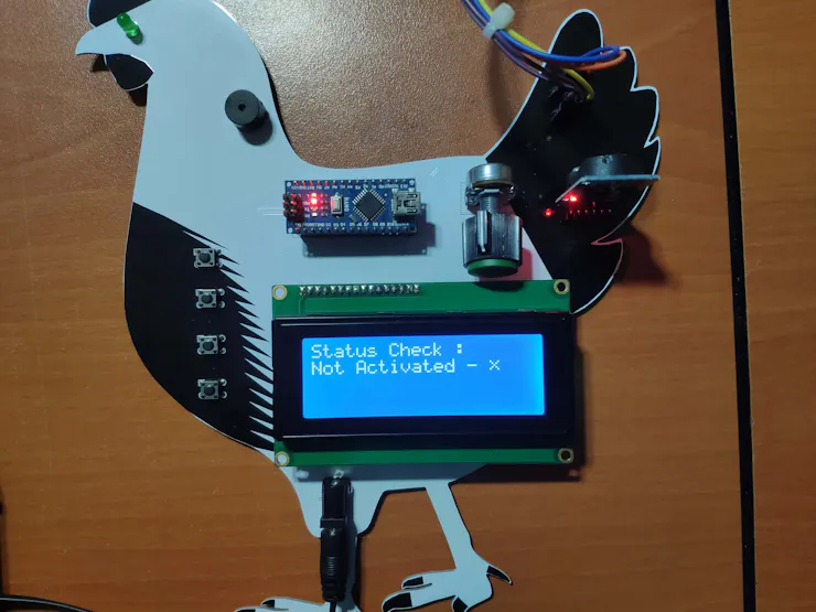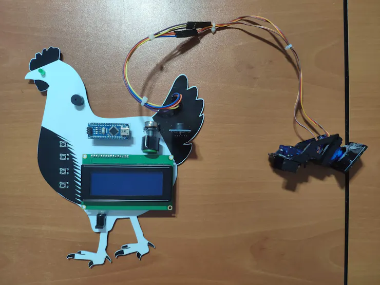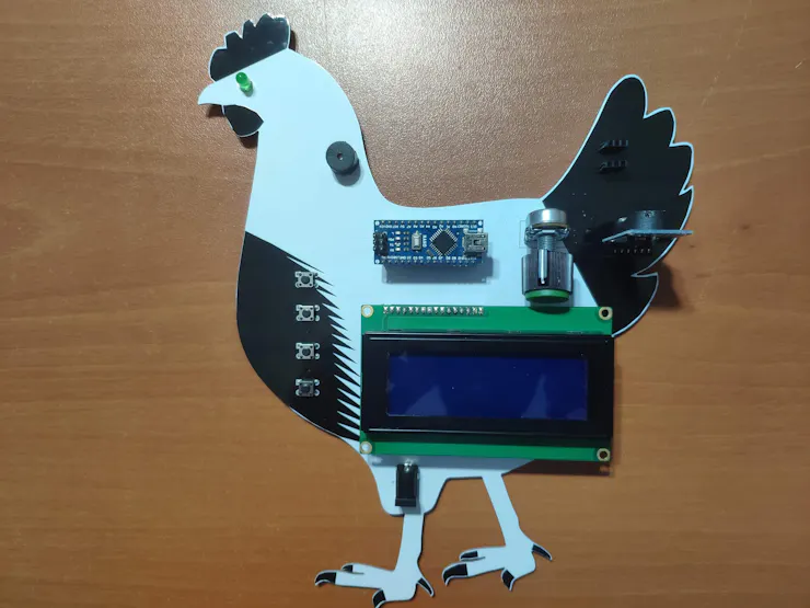 After completing my design on a breadboard and testing the code, I designed a PCB (RTC Bird Feeder V2.0) with a unique chicken shape to create a felicitous and easy-to-use accessory to any chicken coop.