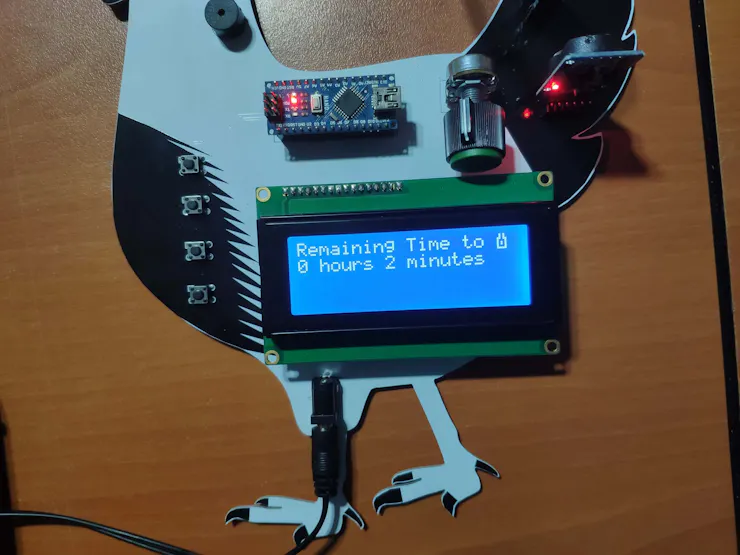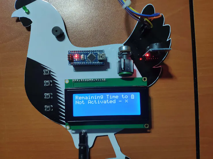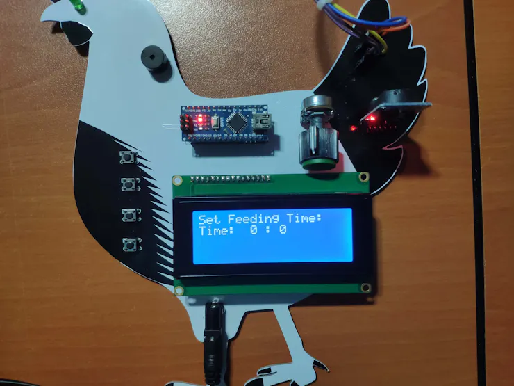 To create an interface to display the mentioned variables, check the device status, set the feeding time, and monitor the remaining time to the feeding time, I used a 20x4 LCD Screen and pushbuttons.