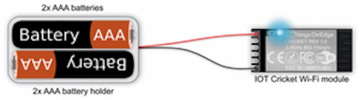We use IOT Cricket WiFi module to make a sensor which will be sending a temperature value every 30 seconds to our system. It will run on a battery so we can stick it anywhere at home or a garden. Later you can also use Cricket to build various battery powered sensors, alarms, buttons, switches and connect them easily by using the same approach to Node-RED.