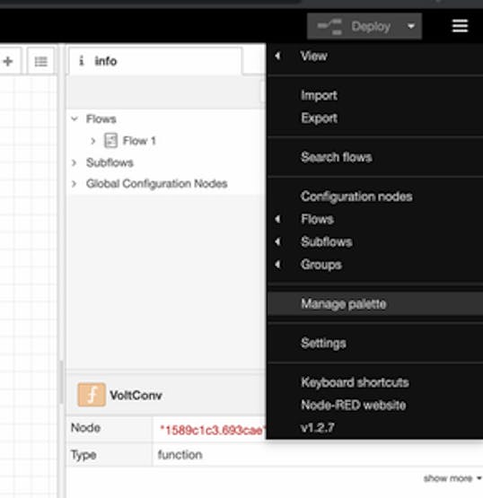 However there is one extra component called "node-red-dashboard", which we have to add to Node-RED. In order to do that, click on the account icon and select "Manage palette" as shown on the image below: