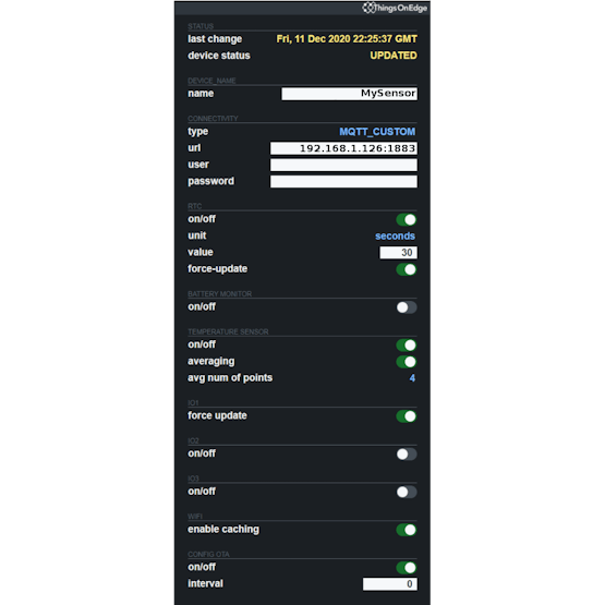 Cricket comes with a built-in temperature sensor (if you wish you can attach external temp sensor to IO2 pin). We just need to configure it to send temperature value to our MQTT broker by setting the RPi IP address.