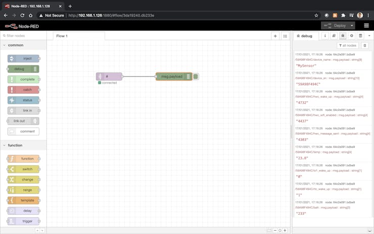Our MQTT receiver is configured. Now we can attach "debug" node to print out all the messages coming from the MQTT broker. Press the "Deploy" button.