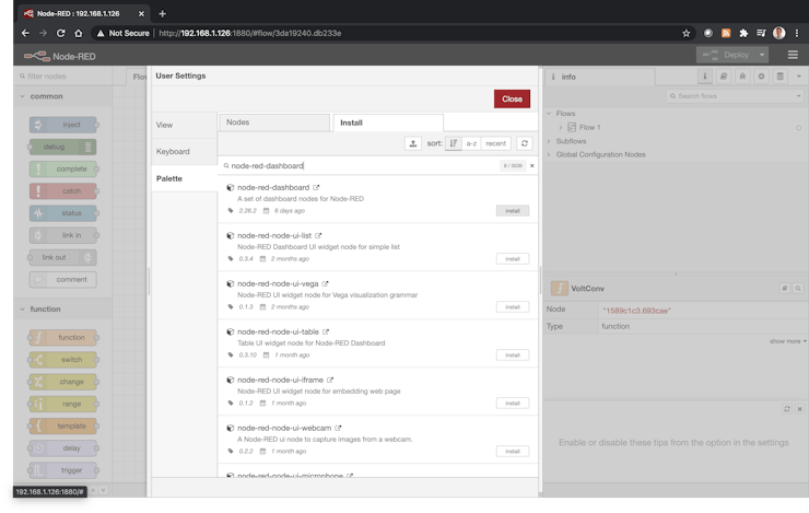 Then go to Install tab, type "node-red-dashboard" and press the install button.