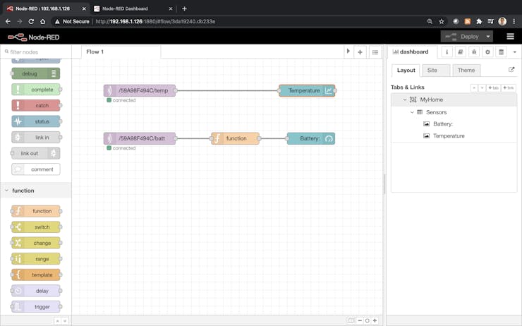 It would be nice to have a nice UI instead of raw print out, wouldn't it? The good news is Node-RED allows to build a decent UI and we will use it to build a basic dashboard for our device to plot a temperature data and show the battery status.