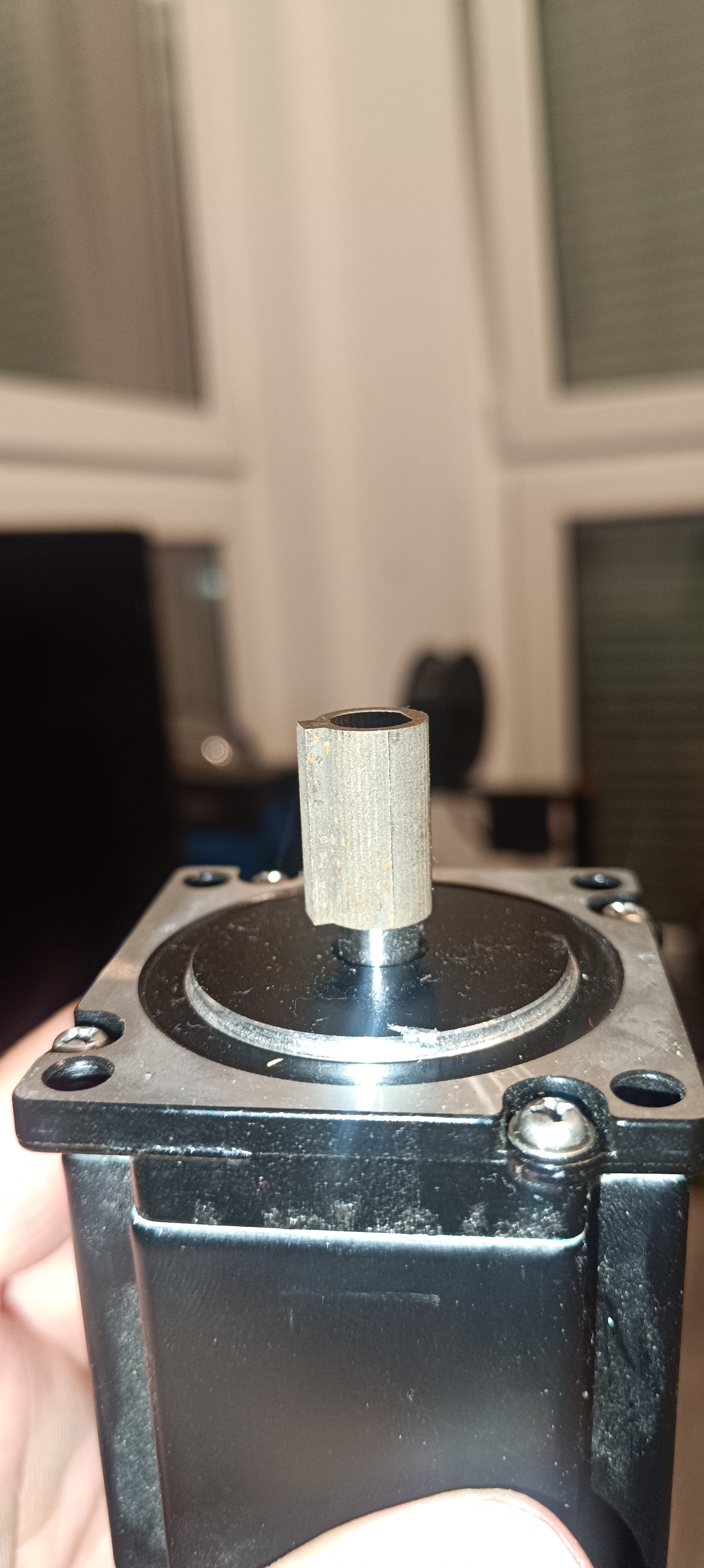 The adapter was made out of a 3/8 inch reducer fitting and a 1/4 inch pipe with a M5 thread cut in it for a screw that fit inside the keyway of the gearbox. All parts were soldered in place to prevent them from coming loose.