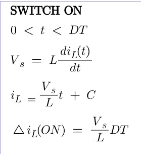 The ON and OFF states. In the ON part, the switch is closed as we can see in the next figure where the diode is open because the cathode voltage is higher than the anode. The key principle that drives the boost converter is the tendency of an inductor to resist changes in current by creating and destroying a magnetic field. In a boost converter, the output voltage is always higher than the input voltage. When the switch is closed, current flows through the inductor in the clockwise direction, and the inductor stores some energy by generating a magnetic field. The polarity of the left side of the inductor is positive. So in this case we obtain the current through the inductor using the next formulas.