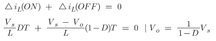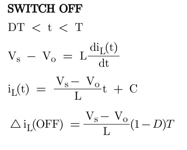 In this case, the voltage across the inductor is the difference between the output voltage and the input. So once again using the next figure formulas we obtain the current of the OFF part depending on the duty cycle.