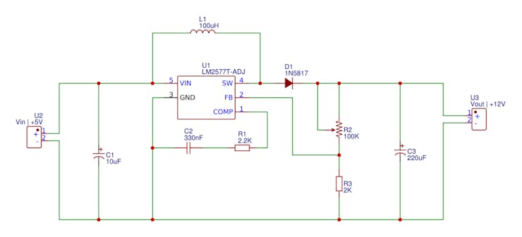The input could up to 12 volts. Don't apply a higher voltage or you could burn the LM2577-ADJ component. In this case, we need no external switch since the LM2577-ADJ already has it inside it. With the feedback pin connected to the output voltage divider, the LM2577-ADJ will change the width of the pulse depending on the output in order to keep it constant. In this case, use a Schottky Barrier Rectifier diode because it has a low forward voltage. This diode will live the current flow when the switch is open.