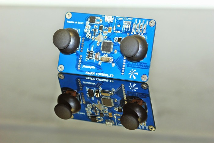The MeBrain is an Arduino-Compatible built on the Mega32u4. We want to make it as simple as possible to use the MeArm, but also pack so much cool stuff under the hood that you can't help but want to tinker.