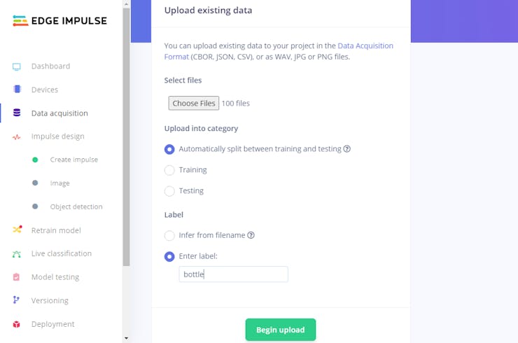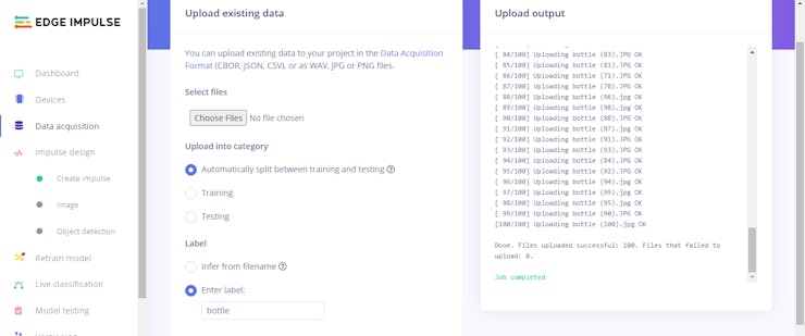 ⭐ Finally, upload images for each litter category to Edge Impulse to create the dataset. It can automatically split them between training and testing sets.