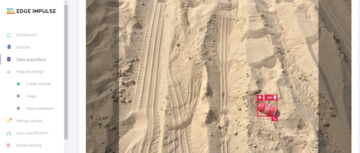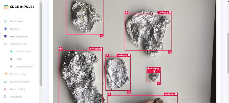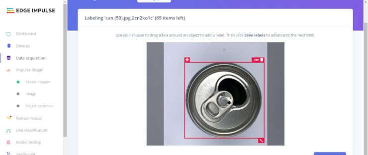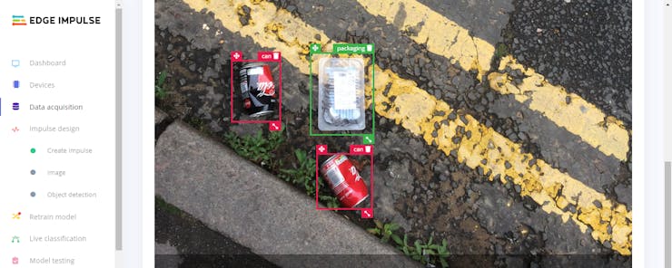 After uploading my litter dataset successfully, I labeled each image with the mentioned three litter categories - bottle, can, packaging. In Edge Impulse, labeling an object is as easy as dragging a box around it and entering a label. Also, Edge Impulse runs a tracking algorithm in the background while labeling objects, so it moves boxes automatically for the same objects in different images.