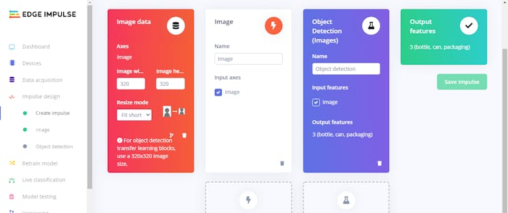 ⭐ Go to Create impulse, set the image width and image height to 320, the resize mode to Fit shortest axis. Then, add the Images and Object Detection (Images) blocks. Finally, click Save Impulse.