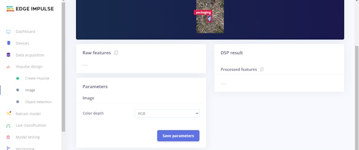 ⭐ To configure the processing block, go to Image under Impulse design, select the color depth as RGB, and click Save parameters. The processing block formats raw image data appropriately for the model.
