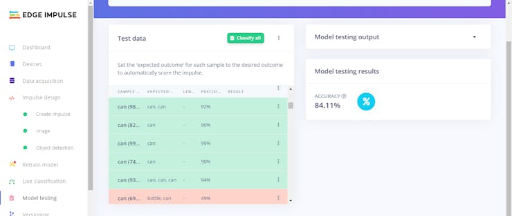 With the testing dataset (approximately 50 images), Edge Impulse evaluated the model accuracy as 84.11%.