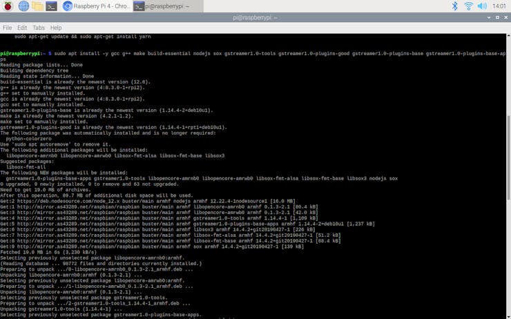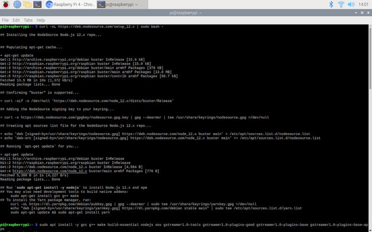 sudo apt install -y gcc g++ make build-essential nodejs sox gstreamer1.0-tools gstreamer1.0-plugins-good gstreamer1.0-plugins-base gstreamer1.0-plugins-base-apps