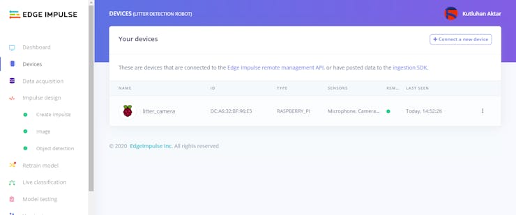 ⭐ To verify whether the Raspberry Pi 4 is connected to the selected Edge Impulse project successfully, go to the project page and click Devices.