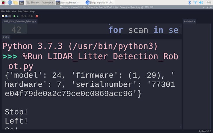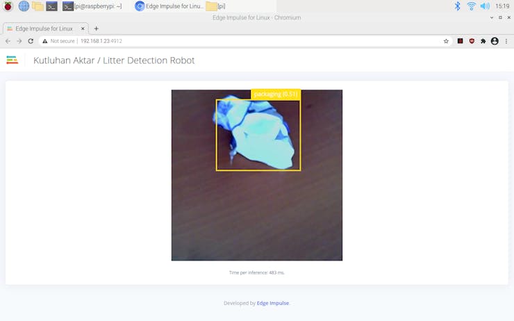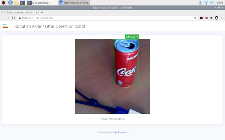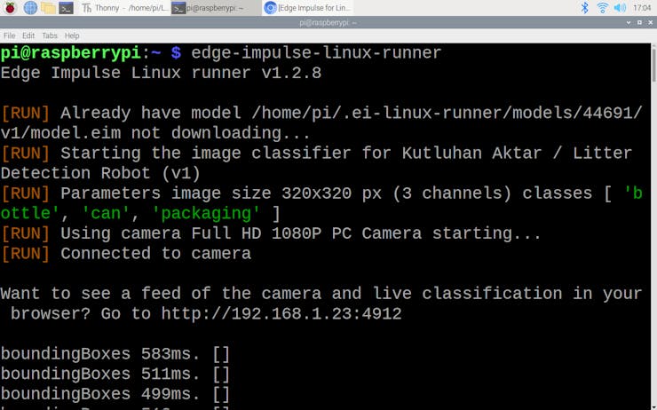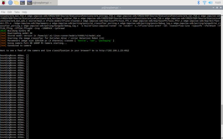 Since Edge Impulse provides a live video stream with the classification results from the connected webcam while the model runs, I did not need to create a webcam server with Motion or other modules to display the classification results while the litter detection robot operates.