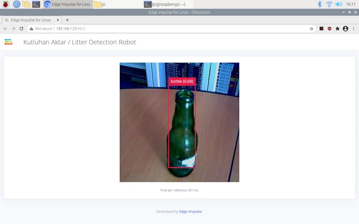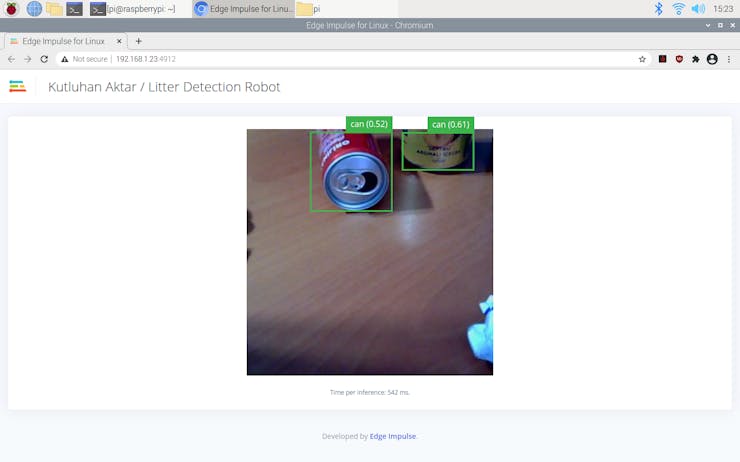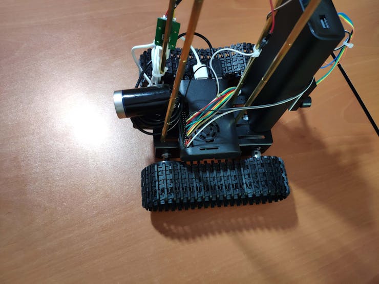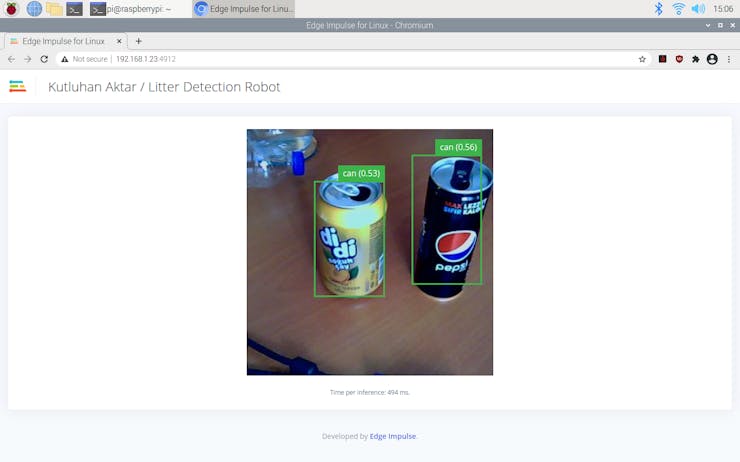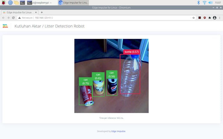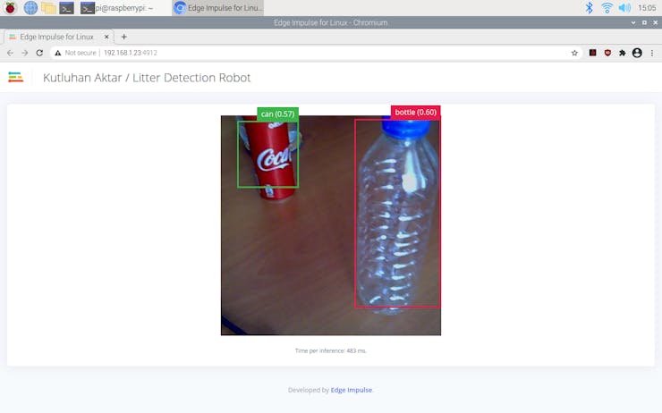 After deploying my model on the Raspberry Pi 4, I connected it and the USB webcam to the robot chassis. Then, I ran the model, and it started to classify between the three litter categories immediately.
