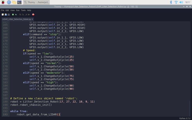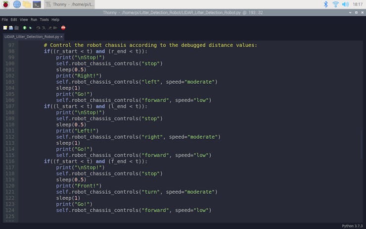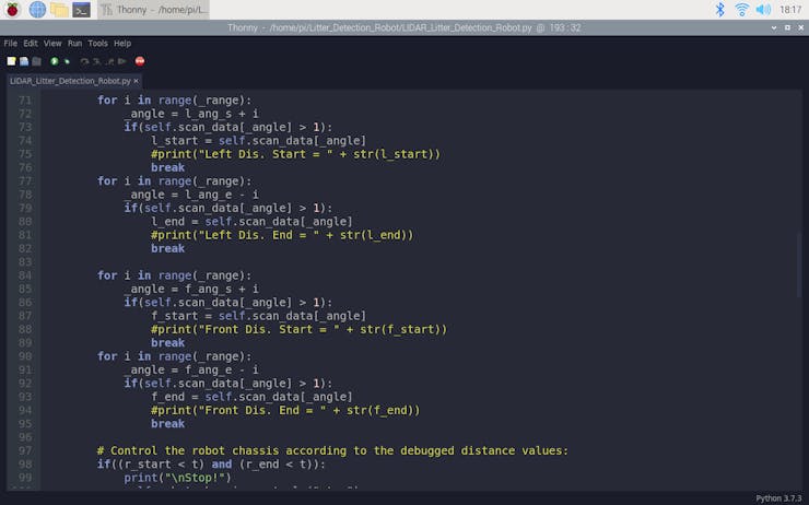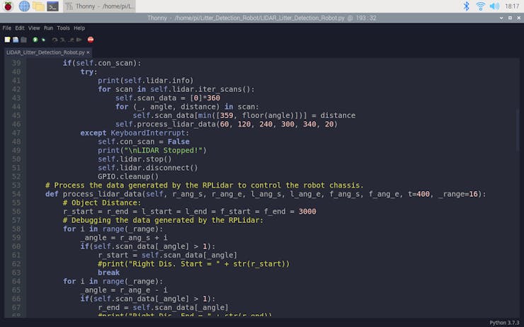After setting up the RPLIDAR A1M8 and including the required modules, I debugged and processed the incomplete 360-degree scan data generated by the scanner for each revolution to detect obstacles in three different directions. For each direction, I defined a starting angle and an ending angle (clockwise):